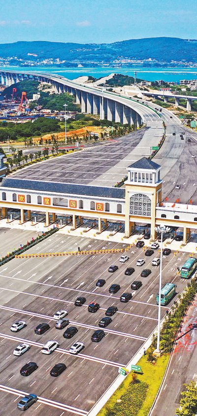 國(guó)慶假期,福建平潭海峽公鐵兩用大橋試通車。該橋是我國(guó)首座跨海公鐵兩用橋,上層為設(shè)計(jì)時(shí)速100公里的6車道高速公路,下層為設(shè)計(jì)時(shí)速200公里的雙線I級(jí)鐵路。圖為試通車的平潭海峽公鐵兩用大橋。
