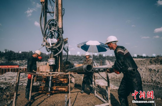 圖為工人們灌漿施工現(xiàn)場。 阮傳龍 攝