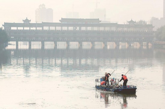 永春縣桃溪,環(huán)衛(wèi)工在打撈垃圾。全面推行河長制,讓全省740條河流都有了“守護(hù)神”。記者 林輝 通訊員 康慶平 攝
