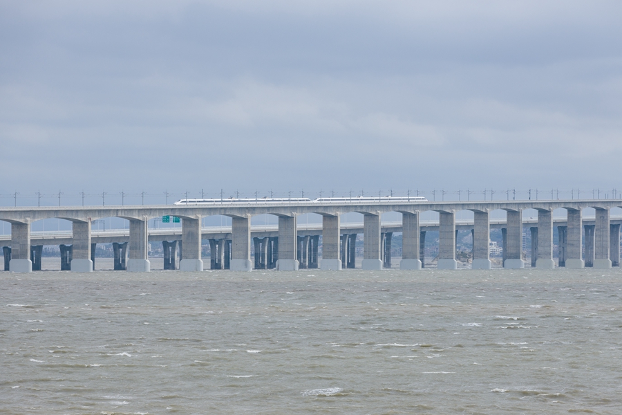 福廈高鐵運行試驗列車行駛在泉州灣跨海大橋上(資料圖)。丁波攝