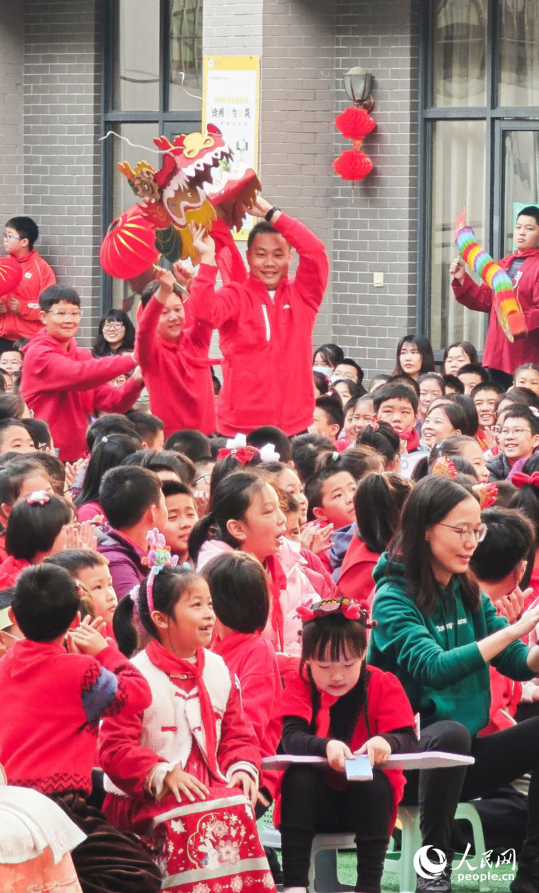 福州市鼓樓區(qū),小學(xué)內(nèi)舞龍擊鼓迎開學(xué)。人民網(wǎng) 黃東儀攝