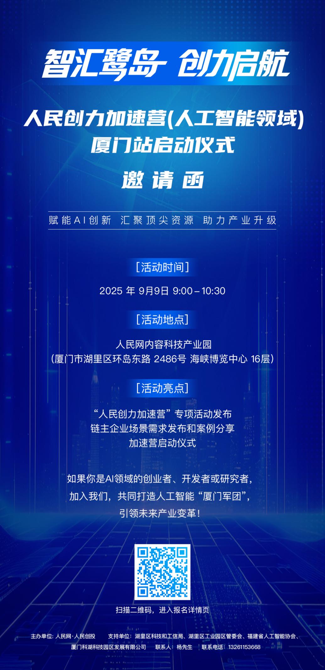 “人民創(chuàng)力加速營(yíng)”自今年4月啟動(dòng)以來(lái),已陸續(xù)在多地及高校舉辦各類(lèi)活動(dòng)。值第二十五屆中國(guó)國(guó)際投資貿(mào)易洽談會(huì)舉辦之際,為推動(dòng)產(chǎn)業(yè)與資本雙向賦能,人民創(chuàng)投計(jì)劃在廈門(mén)市湖里區(qū)舉辦“人民創(chuàng)力加速營(yíng)(人工智能領(lǐng)域)”項(xiàng)目啟動(dòng)儀式,活動(dòng)中將正式對(duì)外發(fā)布入營(yíng)企業(yè)招募,并擇期開(kāi)營(yíng)。可掃描下方海報(bào)二維碼了解詳情。(人民創(chuàng)投)